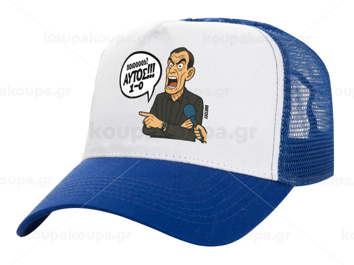 Μπαρτζό, Ποιος? Αυτός!!! 1-0, Adult Structured Trucker Hat, with Mesh, WHITE/BLUE (100% COTTON, ADULT, UNISEX, ONE SIZE)