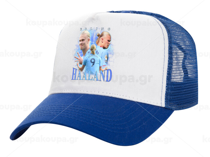Erling Haaland, Adult Structured Trucker Hat, with Mesh, WHITE/BLUE (100% COTTON, ADULT, UNISEX, ONE SIZE)