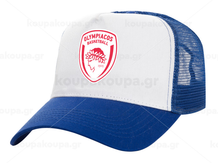 Olympiacos B.C., Adult Structured Trucker Hat, with Mesh, WHITE/BLUE (100% COTTON, ADULT, UNISEX, ONE SIZE)