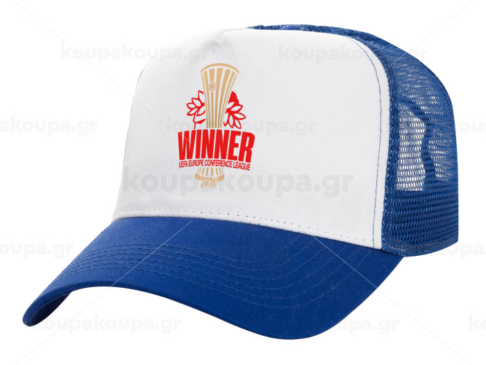 Europa Conference League WINNER, Adult Structured Trucker Hat, with Mesh, WHITE/BLUE (100% COTTON, ADULT, UNISEX, ONE SIZE)