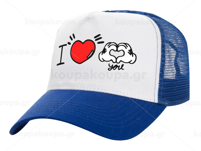 comics hands love, Adult Structured Trucker Hat, with Mesh, WHITE/BLUE (100% COTTON, ADULT, UNISEX, ONE SIZE)