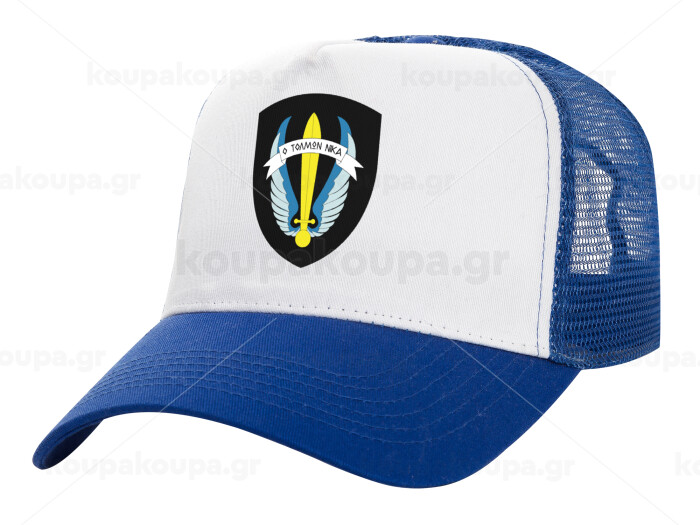 Έμβλημα Μονάδων Καταδρομών Ο Τολμων Νικα - Λοκ, Adult Structured Trucker Hat, with Mesh, WHITE/BLUE (100% COTTON, ADULT, UNISEX, ONE SIZE)