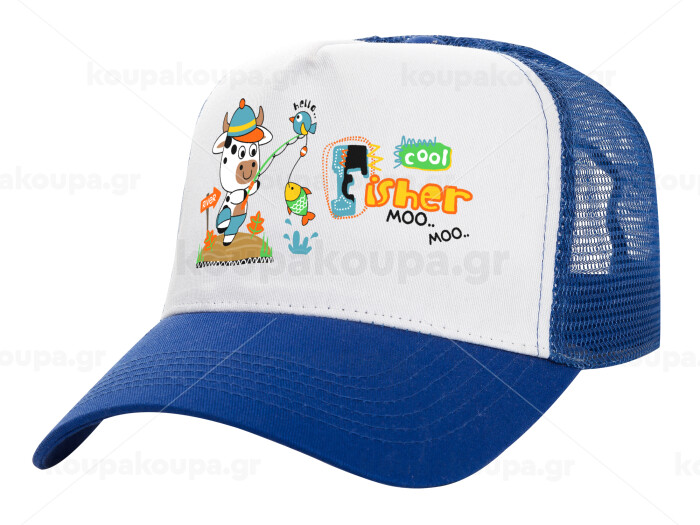 Kids Fisherman, Adult Structured Trucker Hat, with Mesh, WHITE/BLUE (100% COTTON, ADULT, UNISEX, ONE SIZE)