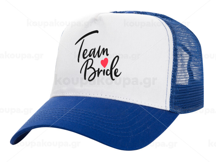 Team Bride red heart, Adult Structured Trucker Hat, with Mesh, WHITE/BLUE (100% COTTON, ADULT, UNISEX, ONE SIZE)