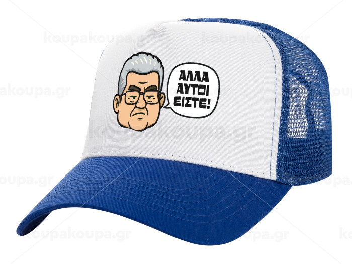 Κουτσούμπας, "Αλλά αυτοί είστε!", Adult Structured Trucker Hat, with Mesh, WHITE/BLUE (100% COTTON, ADULT, UNISEX, ONE SIZE)