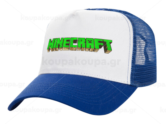Minecraft logo green, Adult Structured Trucker Hat, with Mesh, WHITE/BLUE (100% COTTON, ADULT, UNISEX, ONE SIZE)