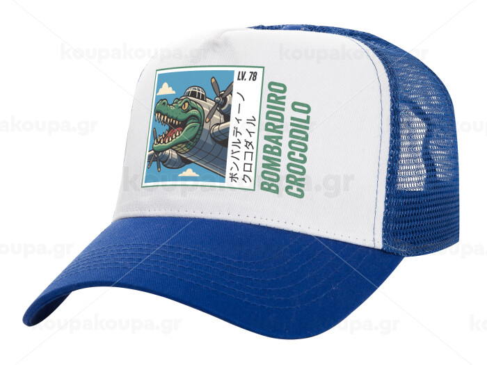 Bombardiro Crocodilo, Adult Structured Trucker Hat, with Mesh, WHITE/BLUE (100% COTTON, ADULT, UNISEX, ONE SIZE)