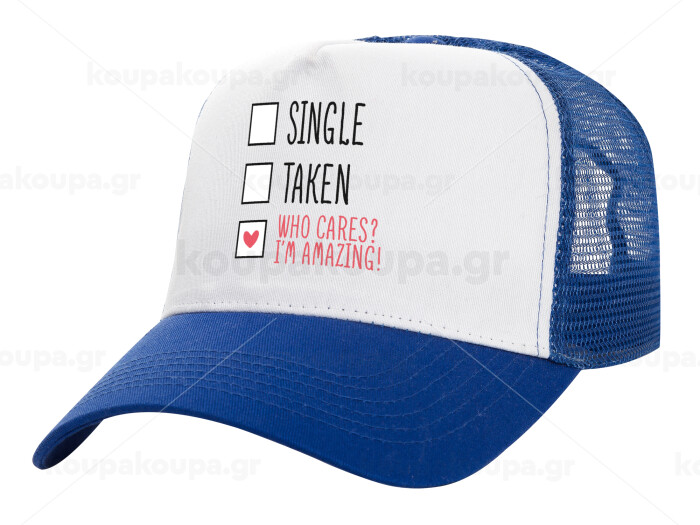 Single, Taken, Who cares i'm amazing, Adult Structured Trucker Hat, with Mesh, WHITE/BLUE (100% COTTON, ADULT, UNISEX, ONE SIZE)
