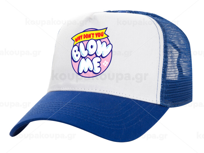Why Don't You Blow Me Funny, Adult Structured Trucker Hat, with Mesh, WHITE/BLUE (100% COTTON, ADULT, UNISEX, ONE SIZE)