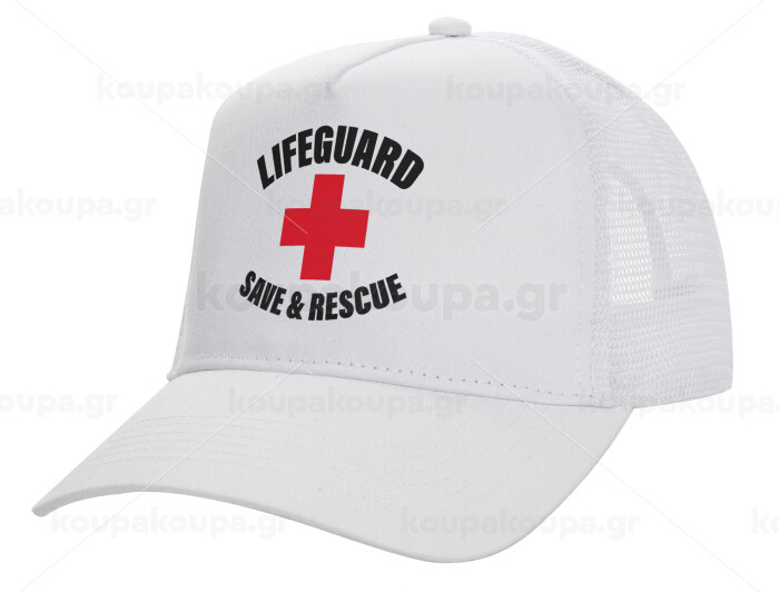 Lifeguard Save & Rescue, Structured Trucker Adult Hat, with Mesh, WHITE (100% COTTON, ADULT, UNISEX, ONE SIZE)