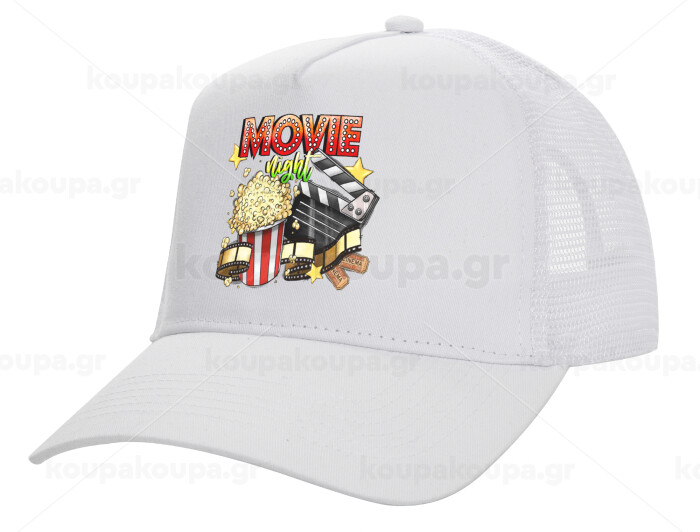 Movie night, Structured Trucker Adult Hat, with Mesh, WHITE (100% COTTON, ADULT, UNISEX, ONE SIZE)
