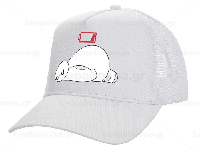 Baymax battery low, Structured Trucker Adult Hat, with Mesh, WHITE (100% COTTON, ADULT, UNISEX, ONE SIZE)