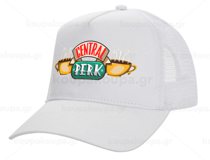 Central perk, Structured Trucker Adult Hat, with Mesh, WHITE (100% COTTON, ADULT, UNISEX, ONE SIZE)