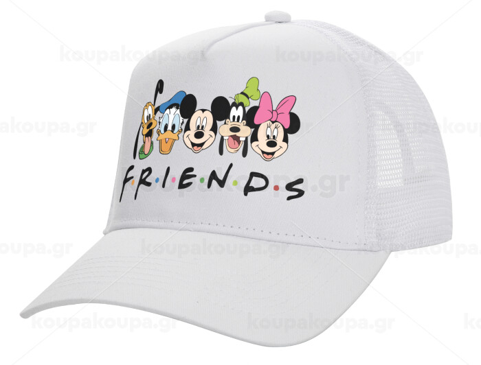 Friends characters, Structured Trucker Adult Hat, with Mesh, WHITE (100% COTTON, ADULT, UNISEX, ONE SIZE)