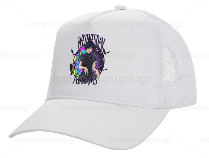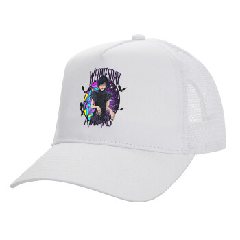 Wednesday Jenna Ortega, Structured Trucker Adult Hat, with Mesh, WHITE (100% COTTON, ADULT, UNISEX, ONE SIZE)