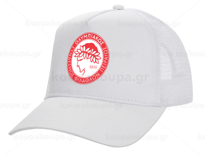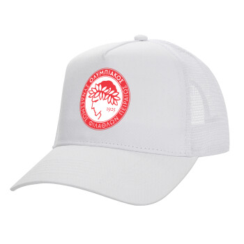 Ολυμπιακός, Structured Trucker Adult Hat, with Mesh, WHITE (100% COTTON, ADULT, UNISEX, ONE SIZE)