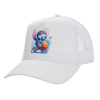 Stitch Basketball, Structured Trucker Adult Hat, with Mesh, WHITE (100% COTTON, ADULT, UNISEX, ONE SIZE)
