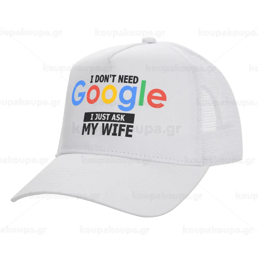 I don't need Google, just ask my WIFE, Structured Trucker Adult Hat, with Mesh, WHITE (100% COTTON, ADULT, UNISEX, ONE SIZE)