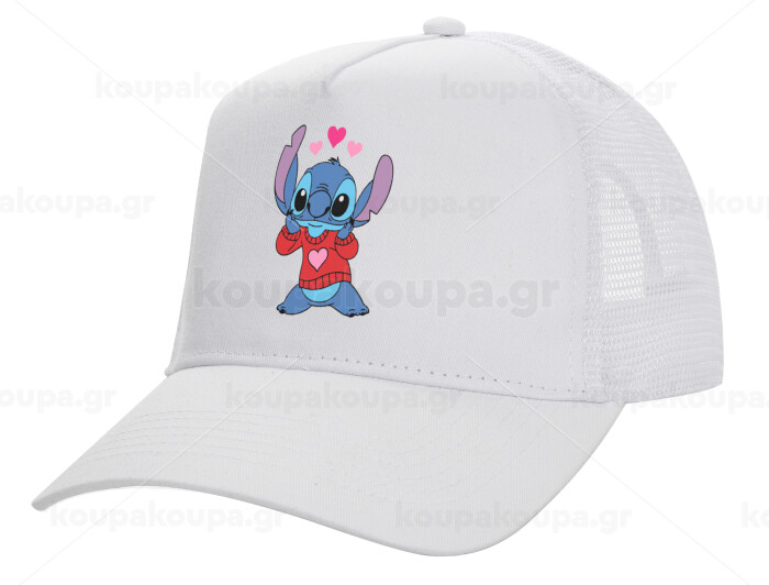 Stitch heart, Structured Trucker Adult Hat, with Mesh, WHITE (100% COTTON, ADULT, UNISEX, ONE SIZE)