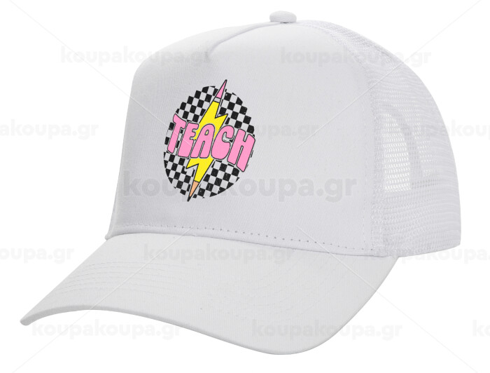 Teach, Structured Trucker Adult Hat, with Mesh, WHITE (100% COTTON, ADULT, UNISEX, ONE SIZE)