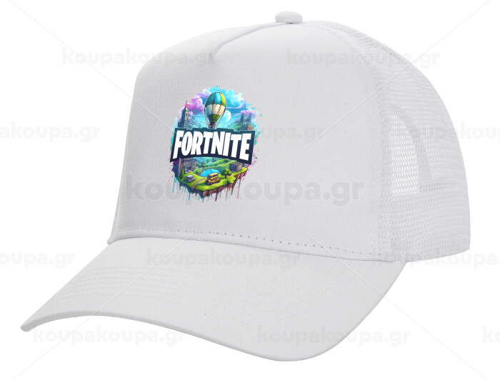 Fortnite land, Structured Trucker Adult Hat, with Mesh, WHITE (100% COTTON, ADULT, UNISEX, ONE SIZE)