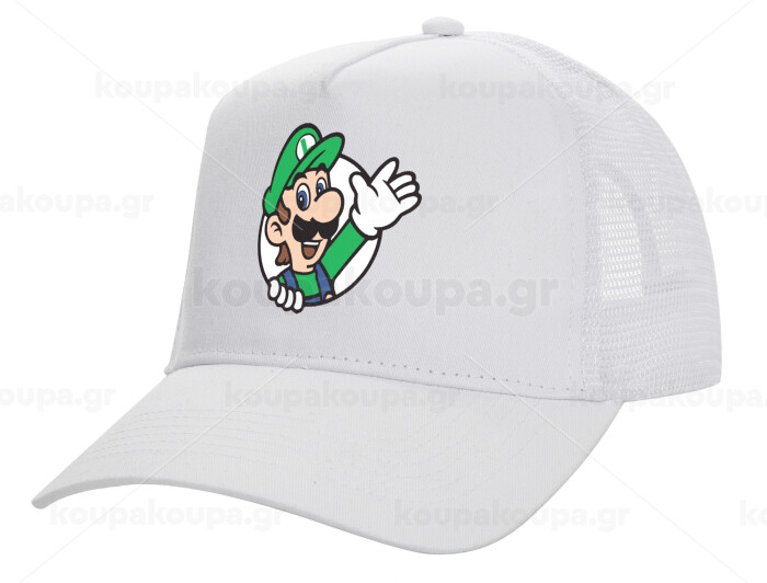 Super mario Luigi win, Structured Trucker Adult Hat, with Mesh, WHITE (100% COTTON, ADULT, UNISEX, ONE SIZE)