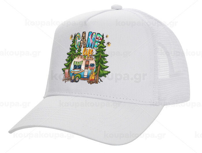 Camp Life, Structured Trucker Adult Hat, with Mesh, WHITE (100% COTTON, ADULT, UNISEX, ONE SIZE)