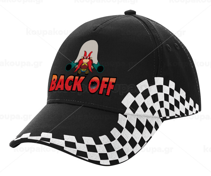 Yosemite Sam Back OFF, Adult Ultimate BLACK RACING Cap, (100% COTTON DRILL, ADULT, UNISEX, ONE SIZE)