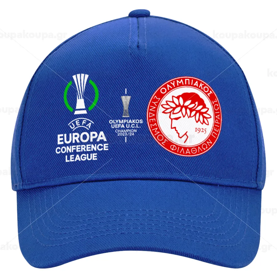 Olympiacos UEFA Europa Conference League Champion 2023/24, Ultimate Adult Hat BLUE, (100% COTTON DRILL, ADULT, UNISEX, ONE SIZE)
