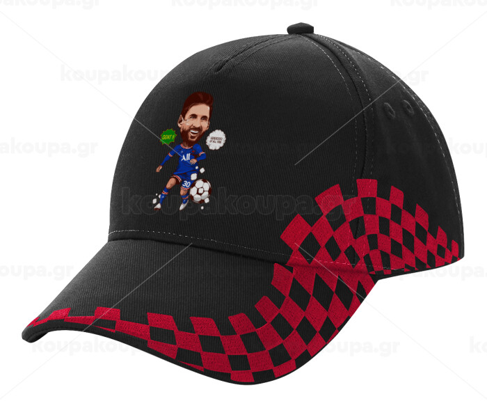Lionel Messi drawing, Adult Cap RACING Ultimate Black/Red, (100% COTTON DRILL, ADULT, UNISEX, ONE SIZE)