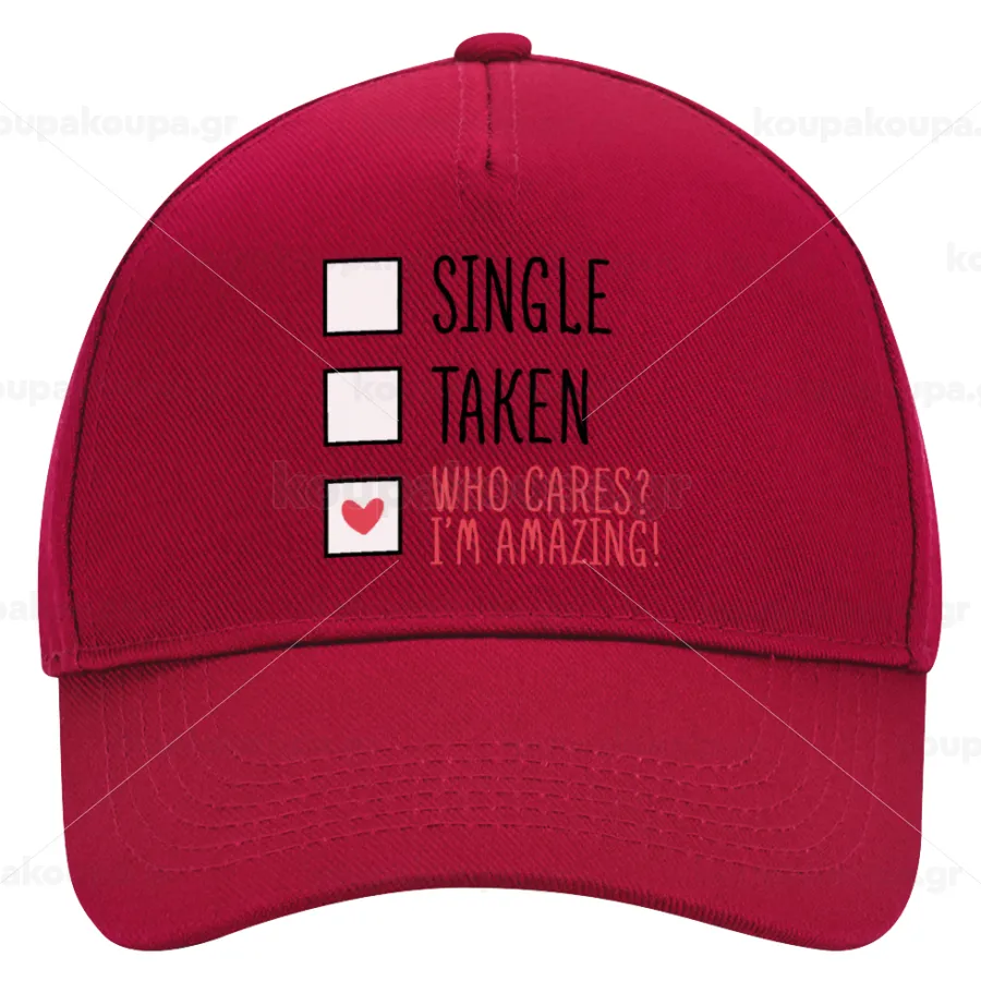 Single, Taken, Who cares i'm amazing, Adult Ultimate Hat RED, (100% COTTON DRILL, ADULT, UNISEX, ONE SIZE)