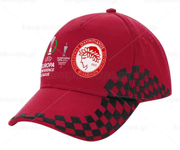 Olympiacos UEFA Europa Conference League Champion 2023/24, Adult Cap RACING Ultimate Red/Black, (100% COTTON DRILL, ADULT, UNISEX, ONE SIZE ADULT)