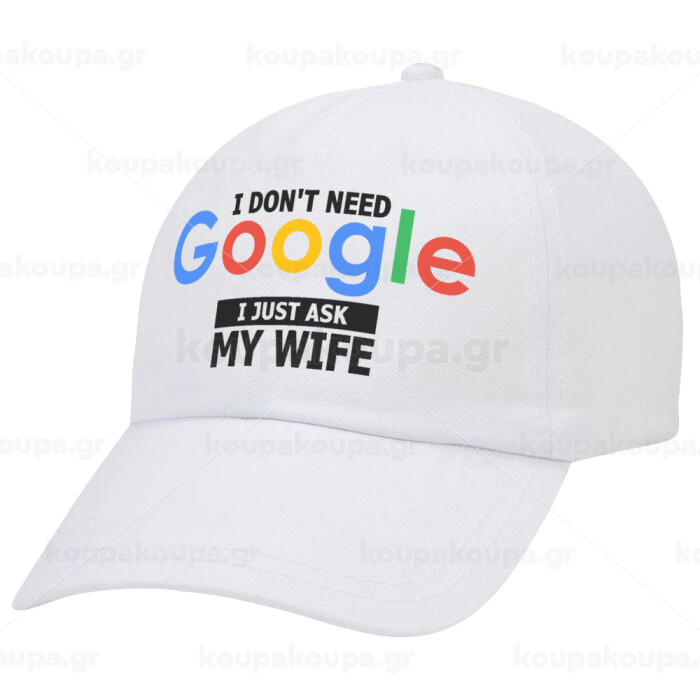 I don't need Google, just ask my WIFE, Adult Baseball Cap White 5-panel (POLYESTER, ADULT, UNISEX, ONE SIZE)