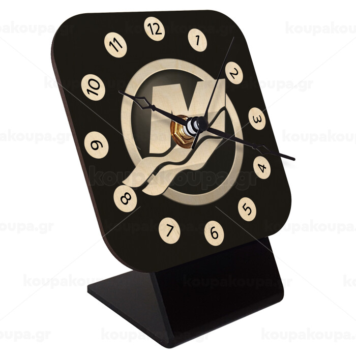 Quartz table clock made of wood. The set includes the clock and its base, the mechanism, and the installation instructions.