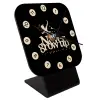 Quartz table clock made of wood. The set includes the clock and its base, the mechanism, and the installation instructions.