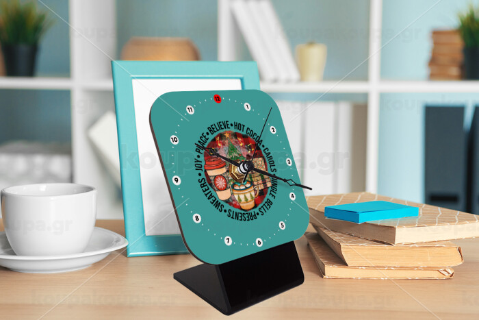 Joy, Peace, Believe, Hot Cocoa, Carols, Quartz Wooden table clock with hands (10cm)