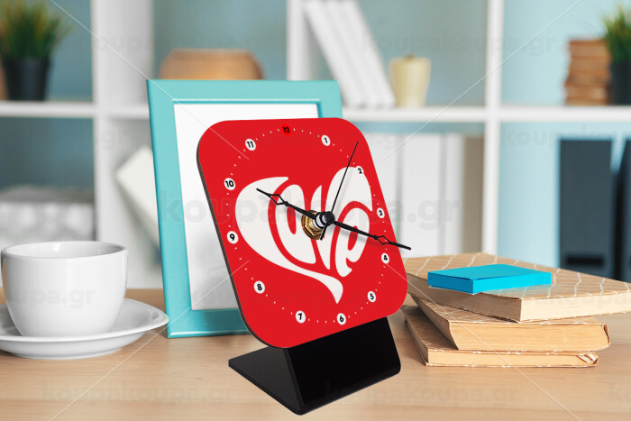 Quartz table clock made of wood. The set includes the clock and its base, the mechanism, and the installation instructions.