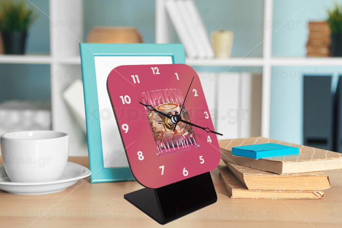 Quartz table clock made of wood. The set includes the clock and its base, the mechanism, and the installation instructions.