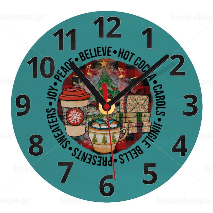 Joy, Peace, Believe, Hot Cocoa, Carols, Ρολόι τοίχου γυάλινο (20cm)