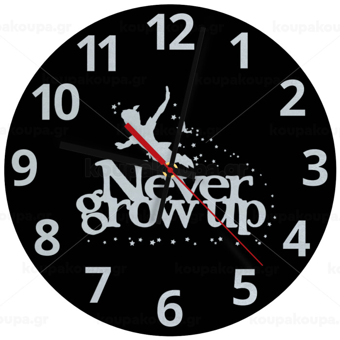 Peter pan, Never Grow UP, Ρολόι τοίχου γυάλινο (30cm)
