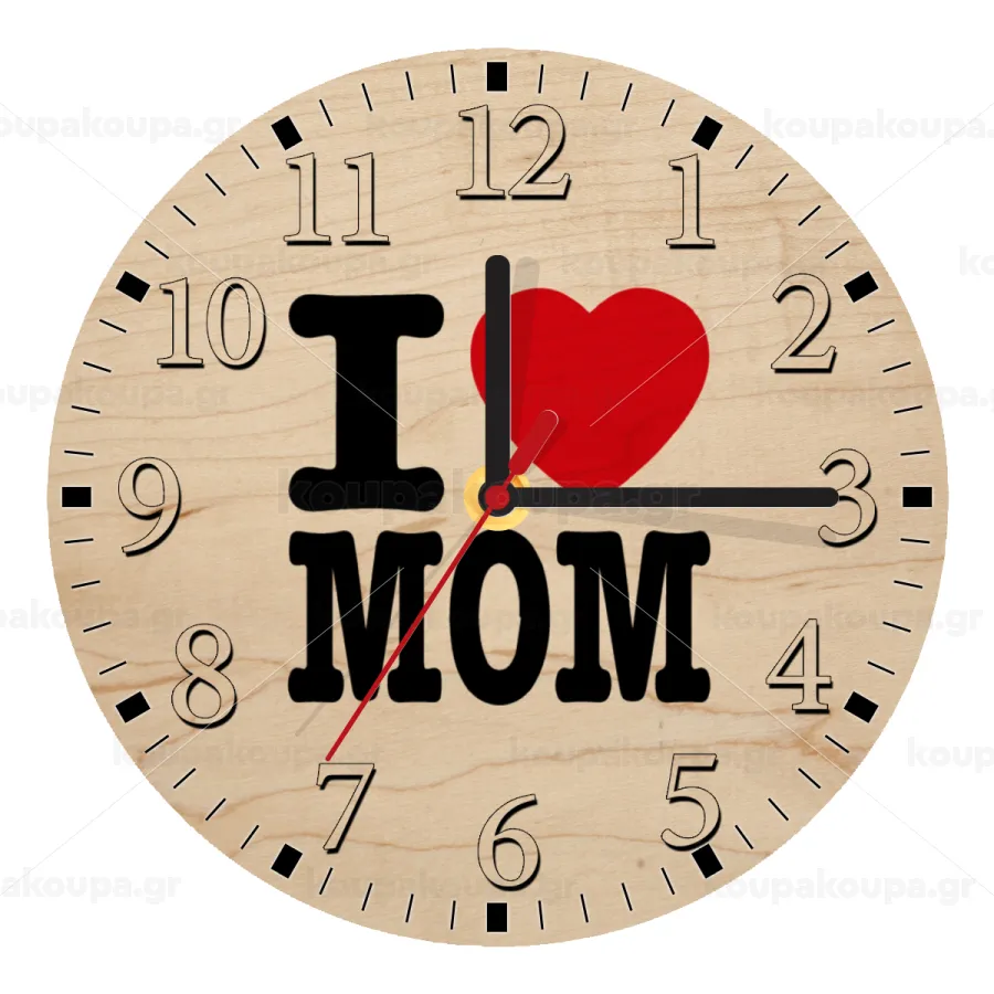 I LOVE MOM, Ρολόι τοίχου ξύλινο plywood (20cm)