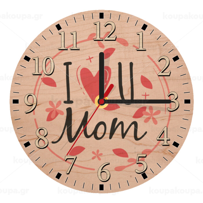 I Love you Mom pink, Ρολόι τοίχου ξύλινο plywood (20cm)