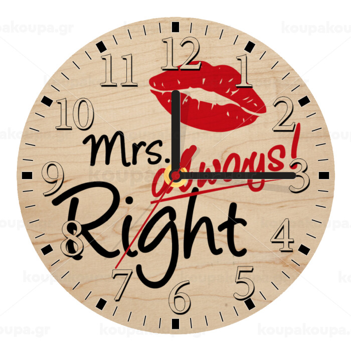 Mrs always right kiss, Ρολόι τοίχου ξύλινο plywood (20cm)