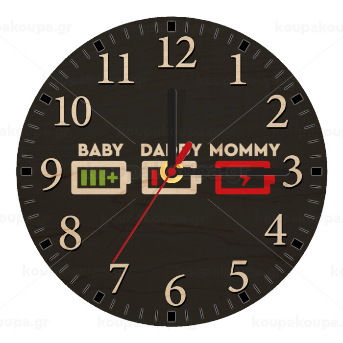 BABY, MOMMY, DADDY Low battery, Ρολόι τοίχου ξύλινο plywood (20cm)