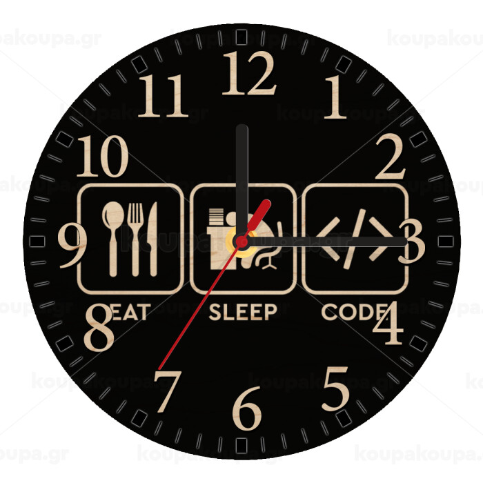 Eat Sleep Code, Ρολόι τοίχου ξύλινο plywood (20cm)