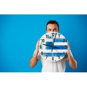 Ελληνική σημαία watercolor, Ρολόι τοίχου ξύλινο (30cm)