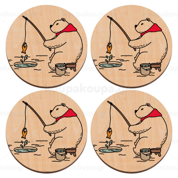 Bear fishing, ΣΕΤ x4 Σουβέρ ξύλινα στρογγυλά plywood (9cm)