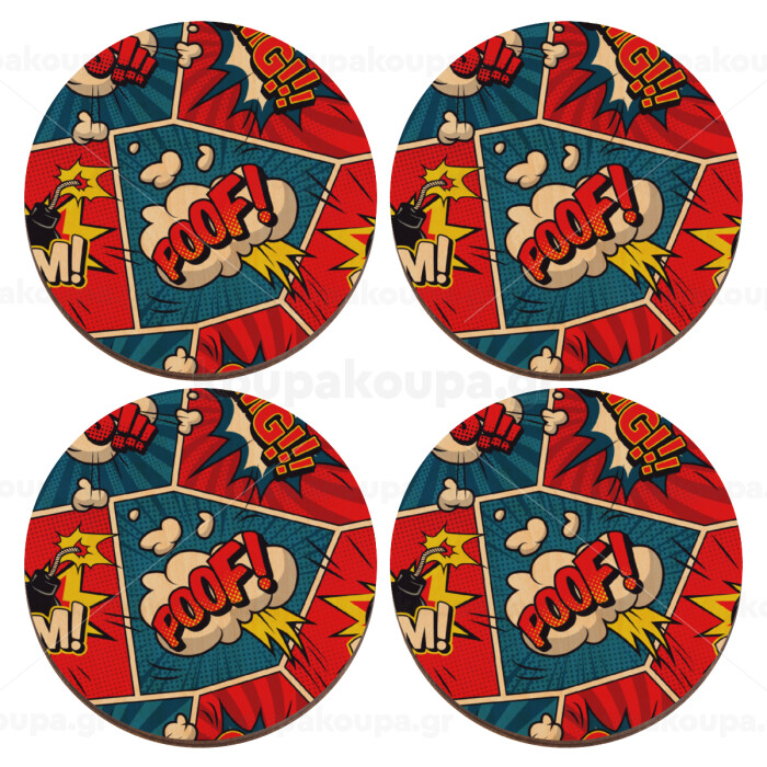 Comic boom!, ΣΕΤ x4 Σουβέρ ξύλινα στρογγυλά plywood (9cm)