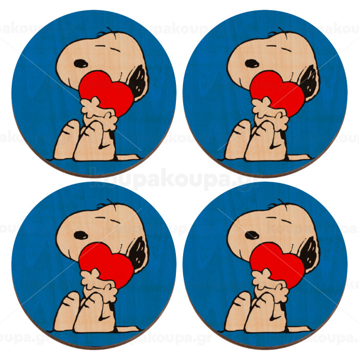 Snoopy, ΣΕΤ x4 Σουβέρ ξύλινα στρογγυλά plywood (9cm)