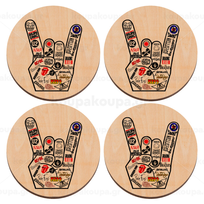 Best Rock Bands hand, ΣΕΤ x4 Σουβέρ ξύλινα στρογγυλά plywood (9cm)